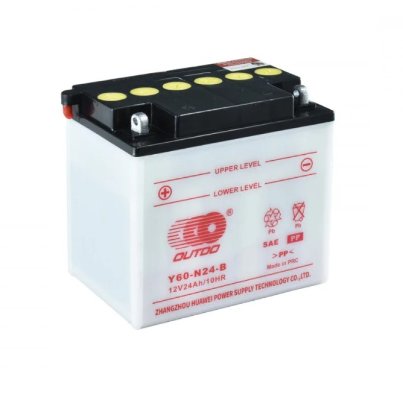 Outdo Y60-N24-A 12V 24Ah 320A L+ — це потужний свинцево-кислотний акумулятор (SLA/Flooded type), розроблений для забезпечення високої продуктивності та надійності для великих мотоциклів, туристичних байків, квадроциклів, снігоходів та іншої спеціалізованої мототехніки. Ця модель вирізняється збільшеною ємністю та високим пусковим струмом, що є критично важливим для запуску двигунів великого об'єму.